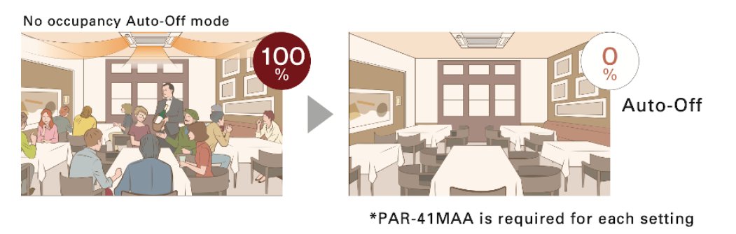 Atunci când camera rămâne goală o perioadă de timp prestabilită, aparatul de aer condiționat se oprește automat, oferind astfel economii și mai mari de energie. Timpul până la oprirea funcționării poate fi stabilit în intervale de câte 10 min, de la 60 la 180 minute.