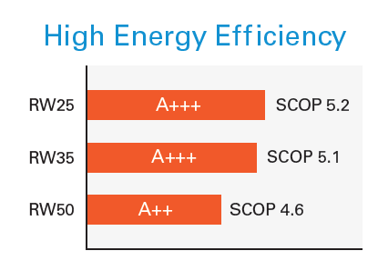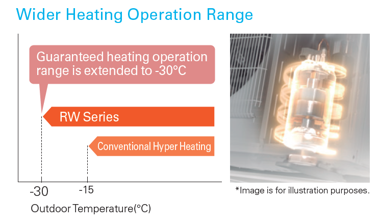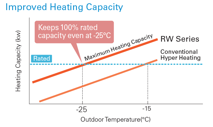 Performanța excepțională de încălzire a seriei RW asigură o temperatură confortabilă în camera dvs. Compresorul puternic al seriei RW atinge o capacitate de încălzire maximă remarcabilă la temperaturi ambientale scăzute, cu o eficiență energetică ridicată. De asemenea, seria RW reușește să atingă 100% din capacitatea nominală chiar și la -25 °C, iar funcționarea este garantată până la -30 °C pentru toate clasele (25/35/50).