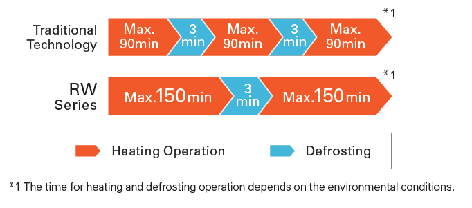 Datorită tehnologiei avansate de detectare a înghețului, seria RW a făcut posibilă asigurarea unei funcționări continue maxime a încălzirii de până la 150 de minute, cu cicluri de dezghețare mai rare, menținând un mediu interior confortabil pe termen lung.
