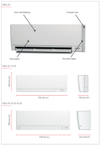 Unitățile MSZ-AY sunt caracterizate de un design sofisticat cu un finisaj satinat și dimensiuni extrem de compacte, cu doar două opțiuni de dimensiuni pentru 6 niveluri de putere diferite