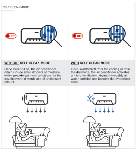 După oprirea ciclului de răcire sau dezumidificare, aparatul de aer condiționat activează o microventilație, uscând complet orice particulă de apă și menținând evaporatorul curat.