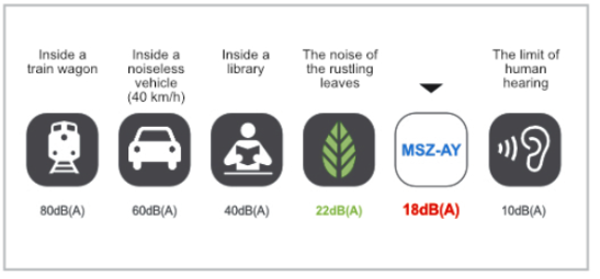Confortul ambiental este strâns legat și de nivelul sonor și este deosebit de important în dormitoare sau birouri. Gama MSZ-AY asigură climatul ideal pe tot parcursul anului cu un nivel de zgomot practic imperceptibil pentru urechea umană. Nivelul de 18 dB(A) atins de modelul MSZ-AY (dimensiunile 25 și 35) este mai silențios decât zgomotul generat de frunzele care foșnesc în vânt, făcând aparatul de aer condiționat practic imperceptibil pentru persoanele din încăpere. Acesta este motivul pentru care MSZ-AY este deosebit de potrivit pentru mediile de acasă, cum ar fi dormitoarele și zonele de zi, unde ne petrecem cea mai mare parte a timpului și ne desfășurăm activitățile zilnice.