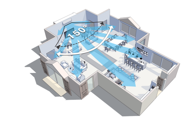 WIDE: Unghiul larg de difuzie a aerului pe orizontală de până la 150° are 7 modele diferite de distribuție controlate de la distanță, pentru a se potrivi oricărui spațiu de locuit.