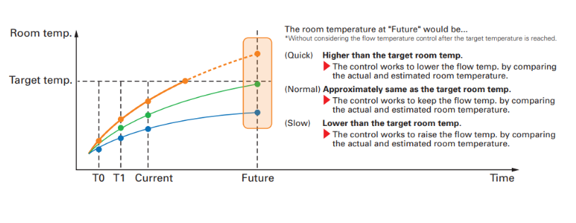 Modul Self-Adaptive al Mitsubishi Electric detectează temperatura mediului interior și exterior și calculează necesarul de căldură care trebuie furnizată camerei, asigurând furnizarea cantității corecte de energie și evitând risipa de energie. În plus, prin estimarea dinamică a tendințelor viitoare ale temperaturii camerei, sistemul evită creșterile inutile ale temperaturii de furnizare; temperatura interioară poate fi astfel menținută stabilă, sporind confortul și economisind energie.
