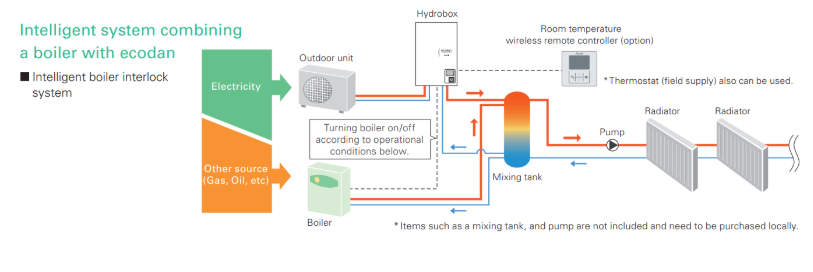 Prin conectarea Hydrobox la o pompă de căldură Ecodan, este posibilă furnizarea de apă caldă pentru încălzire, apă rece și producerea de apă caldă menajeră utilizând un rezervor opțional.