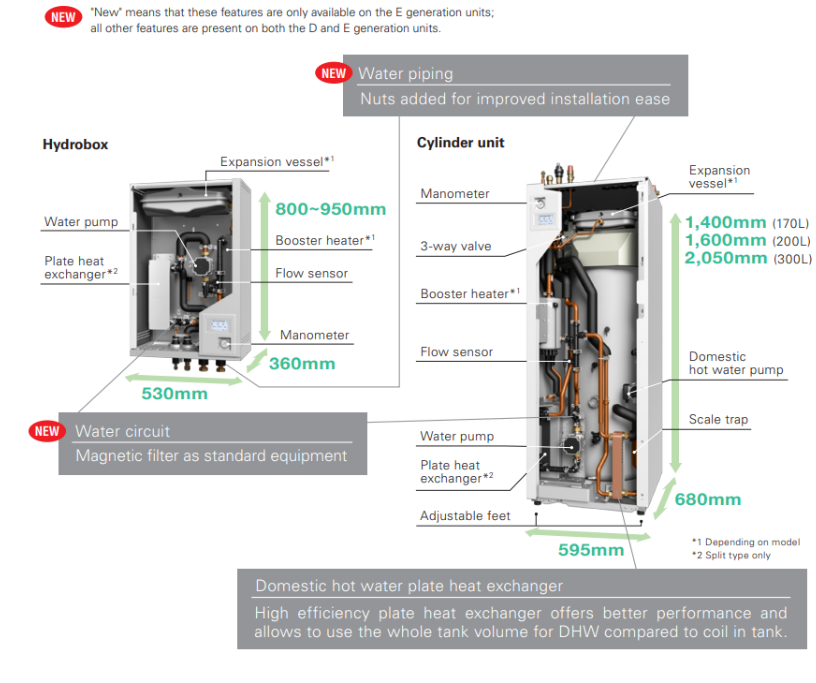 Hydrotank este modulul hidronic de interior pentru instalarea pe podea din gama Ecodan, echipat cu un rezervor de stocare a apei calde de consum din oțel inoxidabil de 170, 200 sau 300 l. Hydrotank este deosebit de compact și conține în interior toate componentele principale ale sistemului hidraulic primar și pentru producția de apă caldă menajeră.