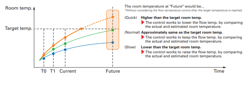 Modul Autoadaptativ de la Mitsubishi Electric detectează temperatura mediului interior și exterior și calculează necesarul de căldură care trebuie furnizat încăperii, asigurând furnizarea corectă a energiei și evitând risipa de energie. În plus, prin intermediul unei estimări dinamice a tendințelor viitoare ale temperaturii camerei, sistemul evită creșterile inutile ale temperaturii de alimentare; temperatura interioară poate fi astfel menținută stabilă, sporind confortul și economisind energie.