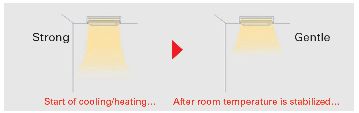 La începutul funcționării în modul de încălzire/răcire, debitul de aer este setat la viteză mare pentru a încălzi/răci rapid încăperea. Când temperatura camerei atinge valoarea dorită, debitul de aer scade automat pentru a menține condițiile de încălzire/răcire stabile și confortabile.