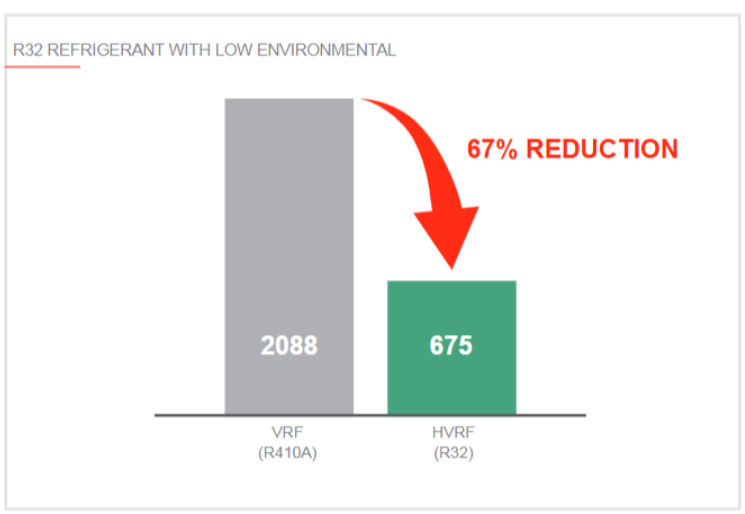 Mitsubishi Electric, începând cu gama HYDRONIC VRF Y, alege agentul frigorific R32 cu un nivel GWP („potențial de încălzire globală ”) scăzut de 675, cu aproximativ 67% mai mic decât valoarea de 2088 a agentului frigorific R410A. Beneficiul constă într-o reducere semnificativă a cantității de CO2 echivalent în mediu. Adăugând împreună avantajele de 61% mai puțin agent frigorific utilizat și un nivel GWP mai mic cu 67%, reducerea totală ajunge la 87% pentru CO2 eliberat în mediu.
