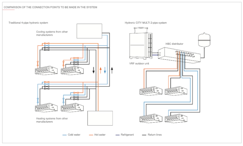 Tehnologia se bazează pe sistemul de recuperare a căldurii City Multi R2 de la Mitsubishi Electric și constă într-o unitate exterioară City Multi seria R2, noul distribuitor inovator Hydronic BC Distributor (HBC), care permite utilizarea agentului frigorific și a apei ca fluide purtătoare de căldură, precum și unități interioare special echipate cu o serpentină de apă.