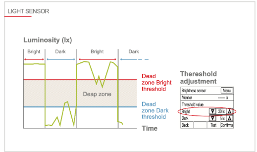 Este disponibilă o gamă largă de luminozitate (1~65535 lx), care poate fi setată direct de la telecomandă prin modificarea pragurilor pentru luminozitate și întuneric.
