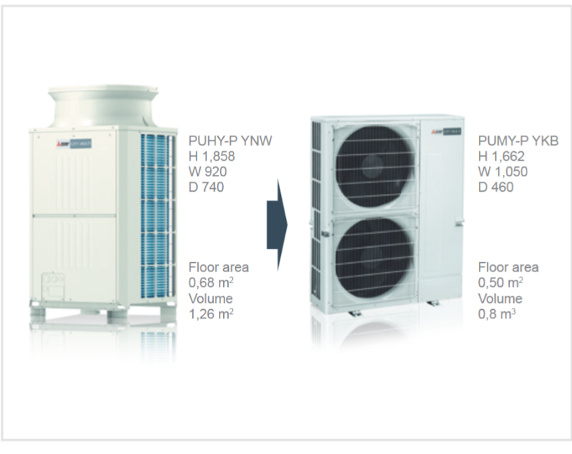 Small Y High Capacity are o amprentă mai mică decât unitățile CITY MULTI Y standard.