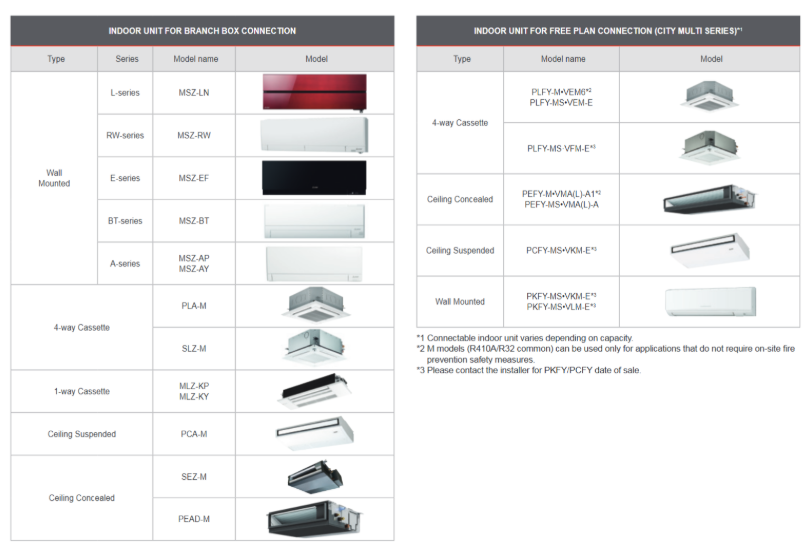 Unitatea exterioară din seria Small Y Compact PUMY-SM-Y/VKM poate fi conectată la unități interioare din gama VRF prezentate în tabel: