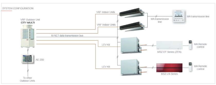 Kitul LEV permite conectarea atât a unităților interioare standard VRF CITY MULTI, cât și a unităților interioare rezidențiale în același sistem VRF. Prin intermediul kitului LEV, este posibil să se conecteze unități interioare rezidențiale elegante și orientate spre design, ale căror caracteristici stilistice se potrivesc perfect sistemelor mari pentru aplicații rezidențiale și hoteliere, unde designul este unul dintre elementele determinante în alegerea unităților interioare.