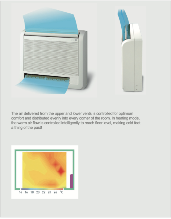 Aparatul de aer condiționat marca Mitsubishi Electric, cu montare pe podea, are un design inovator: un amestec plăcut de forme liniare și funcții diversificate.