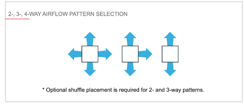Pentru a satisface diferite cerințe de instalare, sunt disponibile trei opțiuni de ieșire a aerului: două căi, trei căi și patru căi. De exemplu, puteți selecta modelul cu patru căi pentru o instalare în centrul camerei sau opțiunea cu trei căi în cazul amplasării în colțuri.