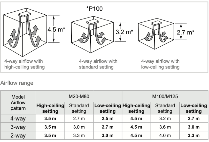 Unitățile au moduri diferite pentru utilizarea cu un plafon înalt sau jos, permițând variația volumului fluxului de aer în funcție de înălțimea camerei. Posibilitatea de a alege volumul optim ajută la optimizarea percepției aerului în întreaga cameră.