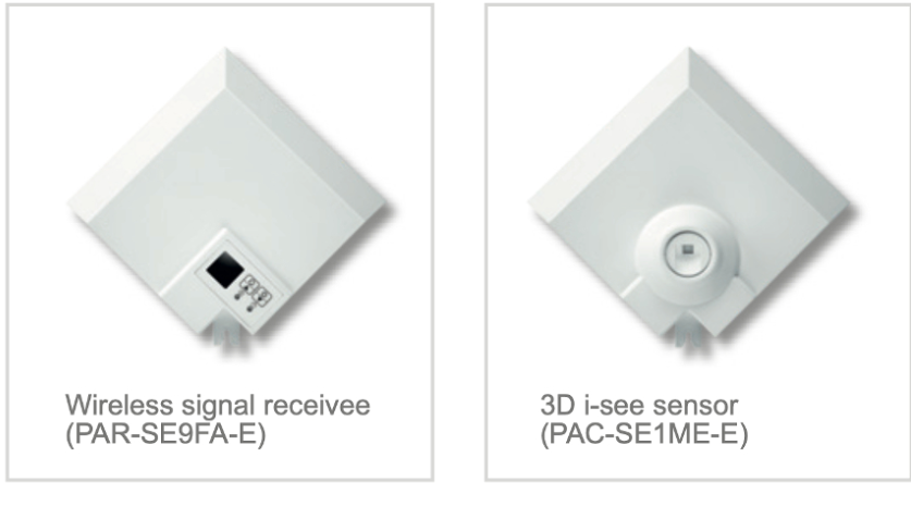 Unitatea vine în mod standard cu grila PLP-6EA fără receptor de semnal. Receptorul de semnal (PAR-SE9FA-E) este disponibil ca receptor unghiular, iar senzorul 3D i-See (PAC-SE1ME-E) poate fi adăugat opțional. Unitatea este furnizată în mod standard fără telecomandă. Pentru control,pot fi utilizate toate comenzile cu fir MA și ME și (dacă este instalat receptorul de semnal) telecomenzile fără fir. Utilizarea noii telecomenzi PAR-SL101A-E cu temporizator săptămânal, iluminare de fundal, setare a temperaturii în incremente de 0,5 °C și control individual al celor 4 deflectoare vă permite să valorificați la maximum toate funcțiile senzorului 3D i-see opțional. Noul panou negru PLP-6EAB poate fi furnizat acum și ca accesoriu. Senzorul 3D i-see și receptorul de semnal infraroșu nu sunt incluse.