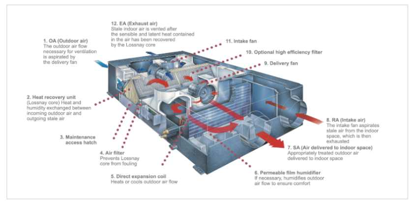 Unitate interioară echipată cu ventilator de admisie a aerului proaspăt, ventilator de evacuare a aerului, sistem de filtrare, unitate de recuperare a căldurii Lossnay prin entalpie, clapetă de bypass, serpentină de expansiune directă.