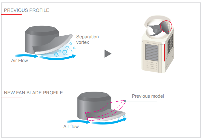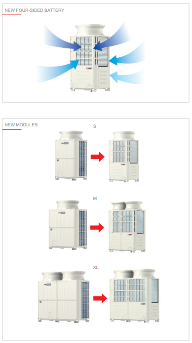 Noile unități de exterior din seria YNW folosesc un schimbător de căldură cu patru laturi aproape de partea superioară a carcasei, lângă ventilator. Această opțiune tehnologică și constructivă face posibilă creșterea eficienței schimbului de căldură.