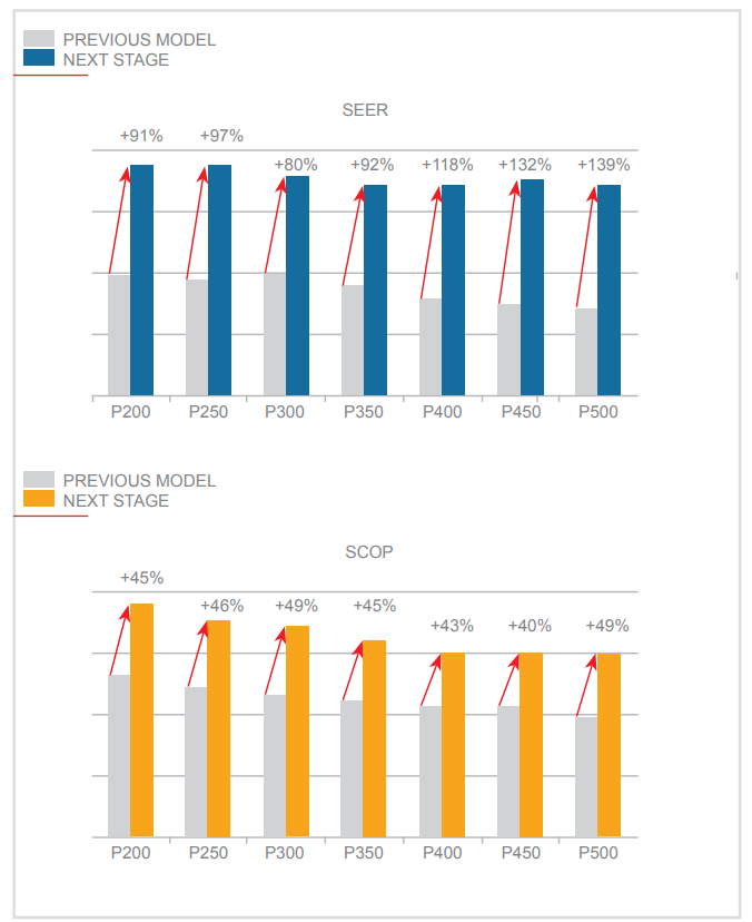 Eficiența energetică a fost îmbunătățită față de unitățile YLM iar acum ajunge la valori de performanță superioare. Valorile SEER au crescut cu 139% (P500) față de modelul anterior iar valorile SCOP cu 49% (P300 și P500). Acest lucru permite noilor unități YNW să consume mai puțină energie la răcire și la încălzire. Economii tot timpul anului.